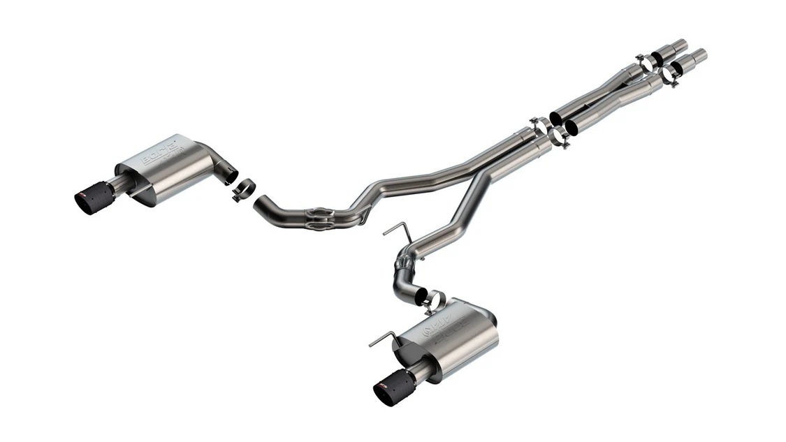 Product Description Exhaust System - ATAK - Cat-Back - 2.5 in Diameter - 4 in Carbon Fiber Tips - Stainless - Natural - Ford Coyote - Ford Mustang 2024 - Kit