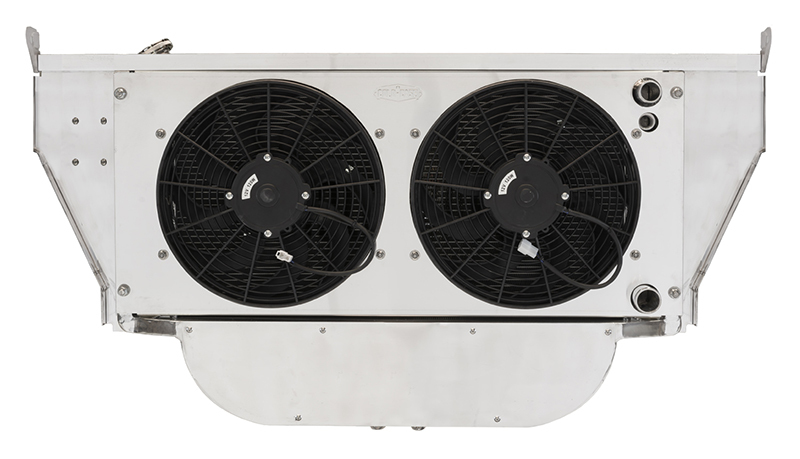 Product Description Radiator and Fan - 22 in W x 17 in H x 2.688 in D - Dual Fans - Passenger Side Inlet - Passenger Side Outlet - A/C Condenser / Radiator Support - Aluminum - Polished - GM LS-Series - Chevy Fullsize Car 1957 - Kit