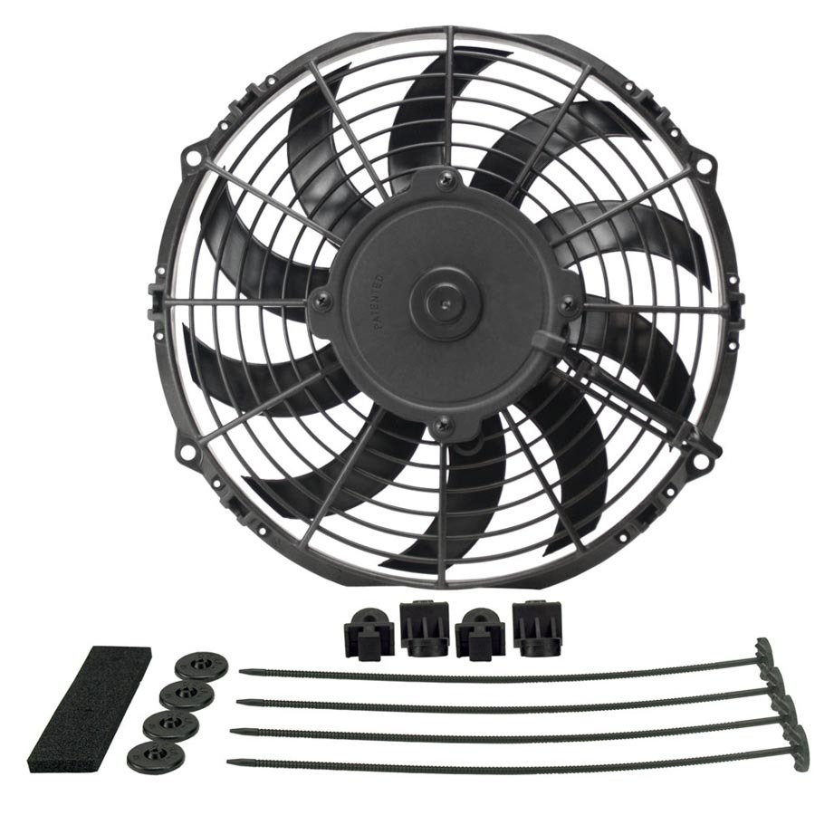 Product Description Electric Cooling Fan - High Output - 10 in Fan - Puller - 802 CFM - 12V - Curved Blade - 11.125 x 10.5 in - 2.063 in Thick - Install Kit - Plastic - Kit