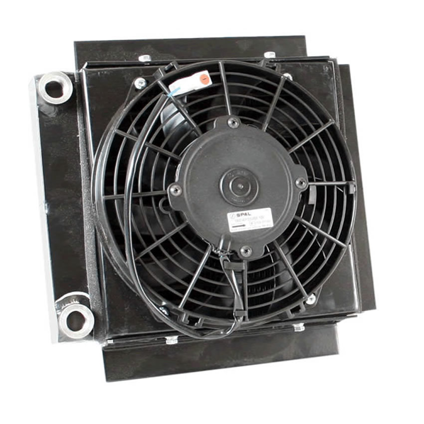 Product Description Fluid Cooler and Fan - 12.06 x 12.47 x 6.39 in - Plate Type - 1/2 in NPT Female Inlet / Outlet - Aluminum - Black Powder Coat - Universal - Each