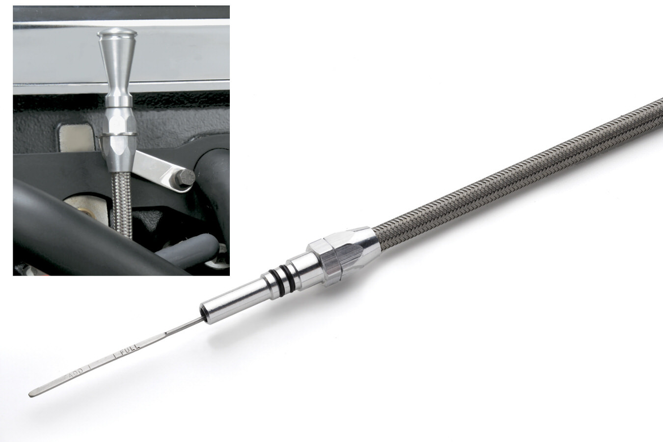 Product Description Engine Oil Dipstick - Pan Mount - Braided Stainless Housing - Aluminum - Clear Anodized - Small Block Ford - Each