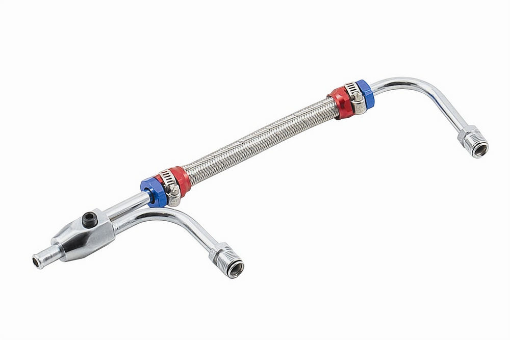 Product Description Carburetor Fuel Line - 3/8 in Hose Barb Inlet - Dual 5/8-18 in Inverted Flare Male Outlets - Adjustable - Braided Stainless - Chrome / Blue / Red - Holley 4150 / 4160 - Kit