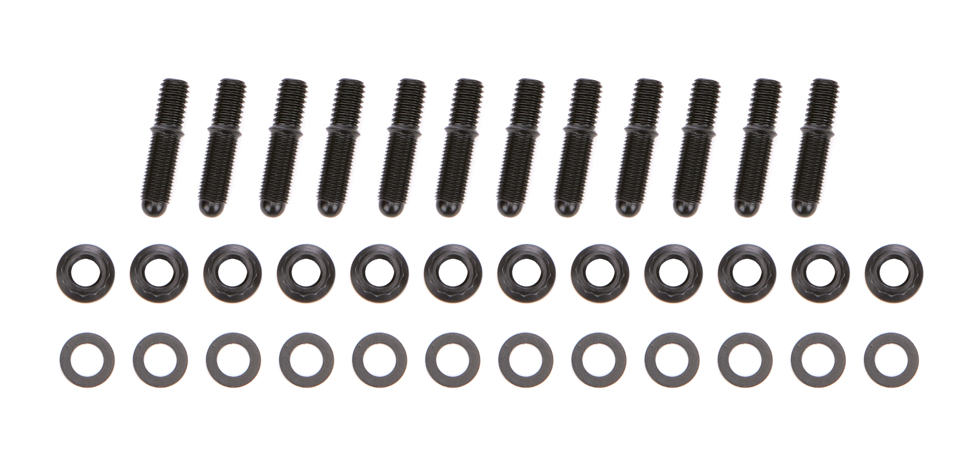 Product Description Header Stud - 3/8-16 and 3/8-24 in Thread - 1.675 in Long - Nuts Included - Broached - Steel - Black Oxide - Small Block Chevy - Set of 12