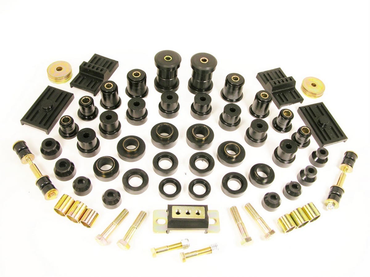 Product Description Bushing Kit - Suspension Bushings - Links / Leaf Spring Pads / Transmission Mount / Dust Boots / Body Bushings / Control Arm Bushings - Polyurethane / Steel - Black / Cadmium Plated - GM F-Body 1975-79 - Kit