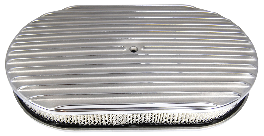 Product Description Air Cleaner Assembly - 15 in Oval - 2 in Tall - 5-1/8 in Carb Flange - Raised Base - Finned - Aluminum - Polished - Kit